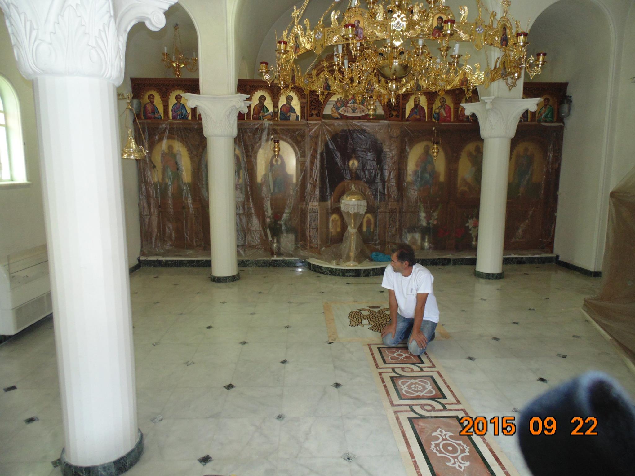 As you will see in the photos, we filled the marbles with a special colored liquid putty. The scrubbing was done from the beginning with water to liquefy the dust and with a special broom we collected the water with the mud. So there was no dust at all, the temple functioned normally without the need for cleaning, except that we removed the nylon from the sanctuary and brought in some pews and after the divine service we continued the work until late...