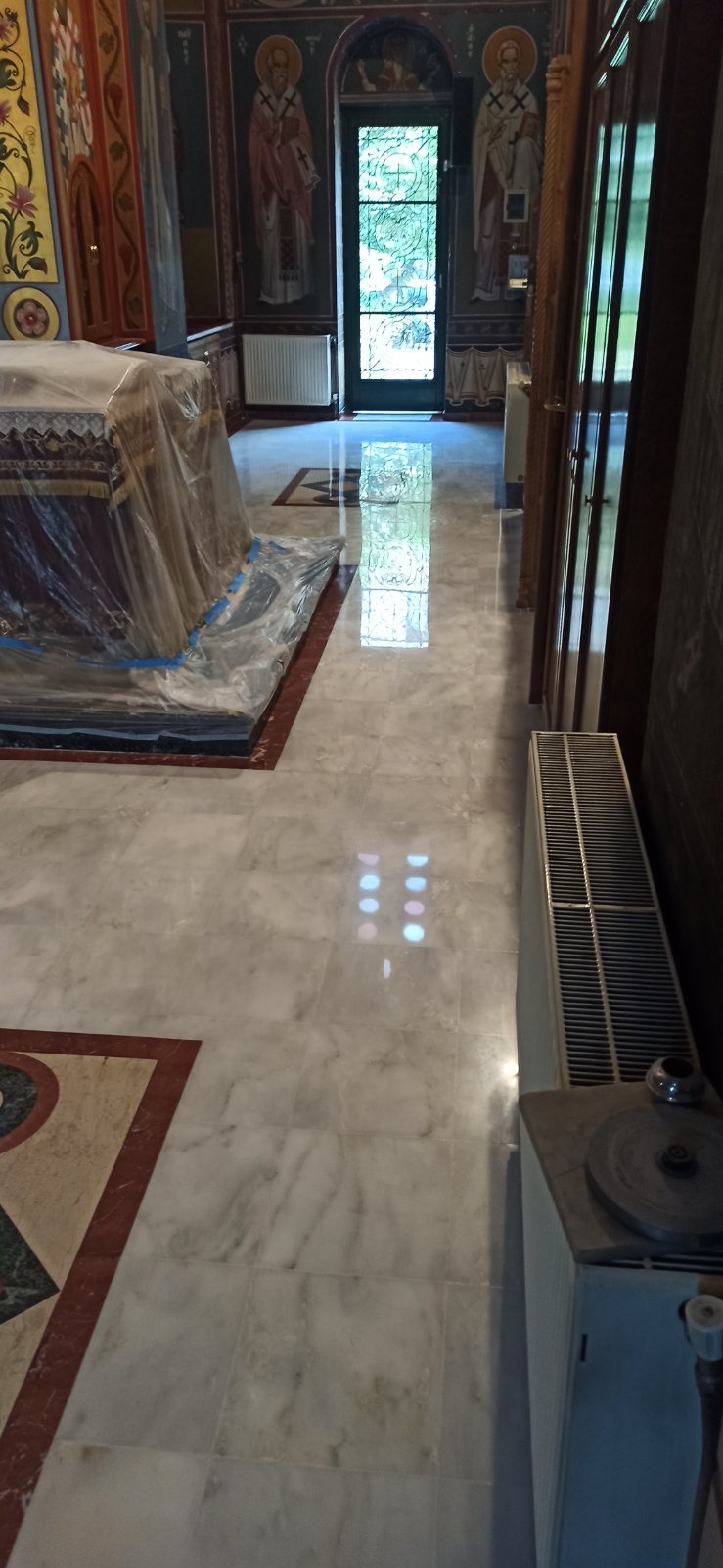 The restoration of marble surfaces and joints in the church was carried out with great care to preserve both the structural integrity and the sacred atmosphere of the building. The work included cleaning the marble to remove accumulated dirt, stains, and wear caused by time and environmental factors. Damaged sections of the marble were carefully repaired, restoring them to their original beauty.